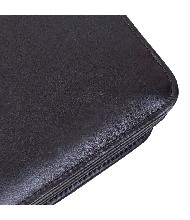 Изготовлен из натуральной кожи чёрного цвета. Имеет множество внутренних отделений для денег, банковских и кредитных карт, документов и мелочей. Оснащен хлястиком для удобства переноски в руке. Молния от мирового лидера в производстве фурнитуры - YKK.